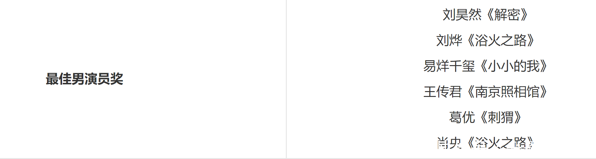 六部电影题材各不相同,《浴火之路》同时提名了肖央和刘烨,长春电影节不擅长下“双黄蛋”,片方不得罪人提名两位演员,组委会也不想得罪人的话就谁也不给。先把这二位去掉,而且也不冤枉,毕竟俩人演技不算特别亮眼。