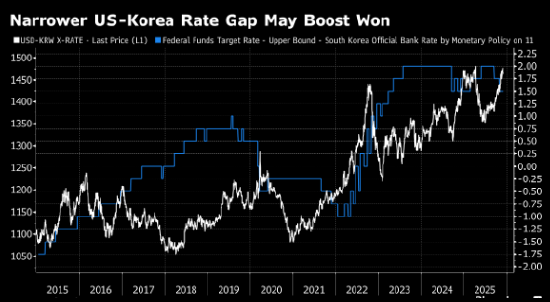 韩国暂停降息将缩小与美国的利差 —— 今年该利差曾扩大至2个百分点,创1999年有记录以来最大差距。